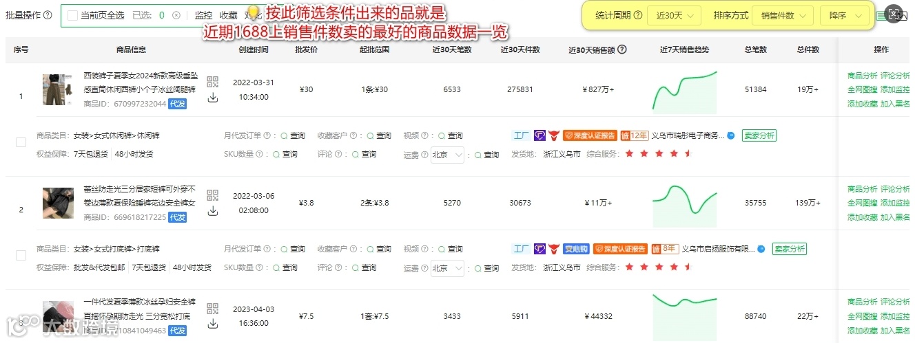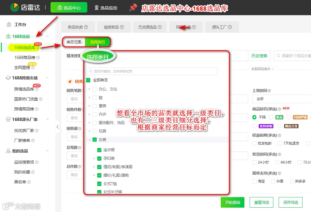 首先我们要找专业数据分析网站,像店雷达。选品前先选类目,初步定位符合自己产品方向后再去分析市场,想看全市场的品类就选择一级类目,也有二三级类目细分选择可以根据检索要求,根据商家经营目标而定直接筛选获取全1688上近7天销量数据刚起来的各个类别的爆品,一步到位。