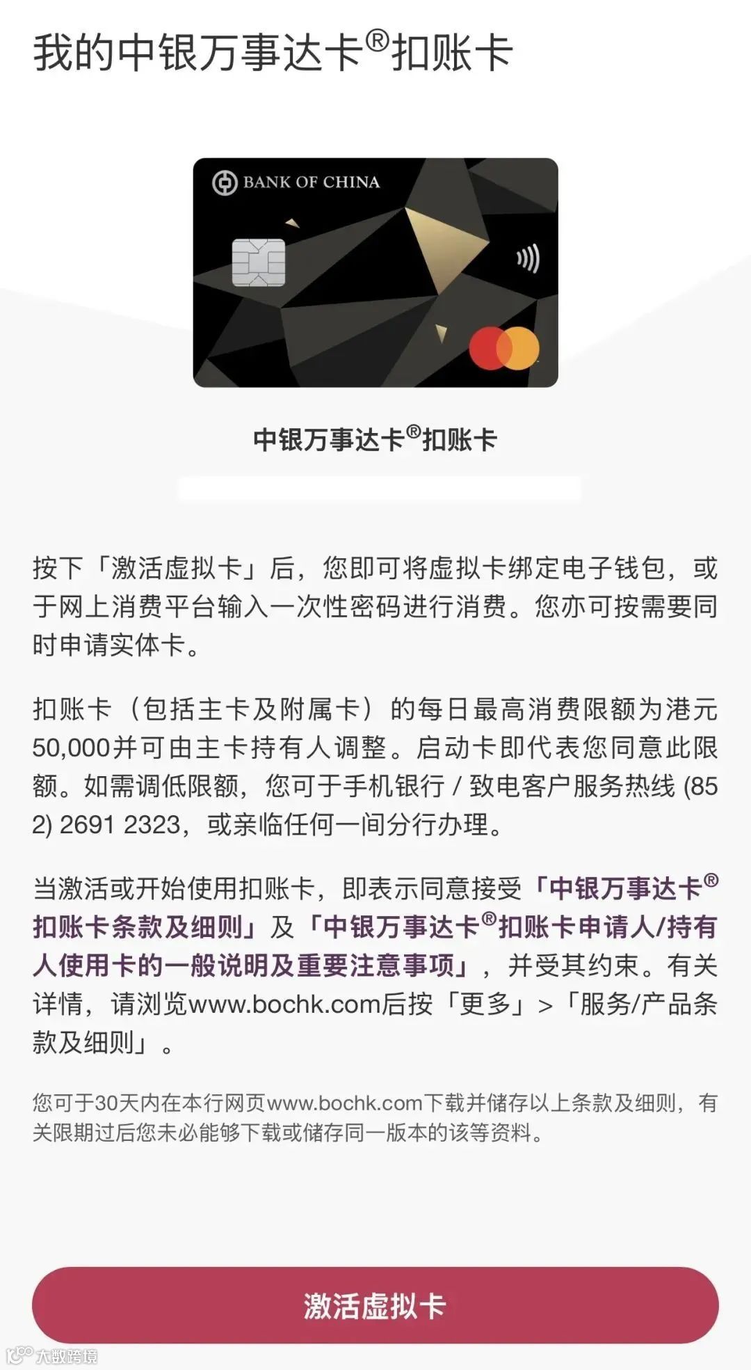 1. 路径:「选单」→「账户」→「我的中银卡/扣账卡」→ 选择万事达卡 → 点击「激活虚拟卡」