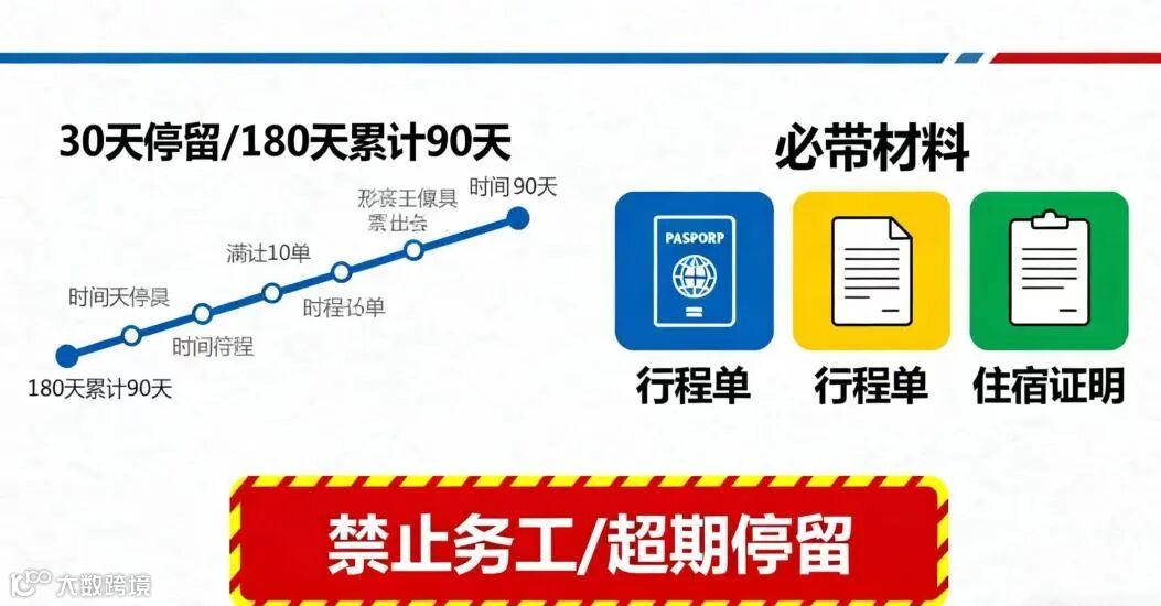 • 合法事由:仅限私人事务、商务活动、旅游、医疗及国际运输,工作、留学、务工等必须提前办理对应签证——在集贸市场售卖商品、建筑工地务工等均属违法,不可凭免签入境开展此类活动。