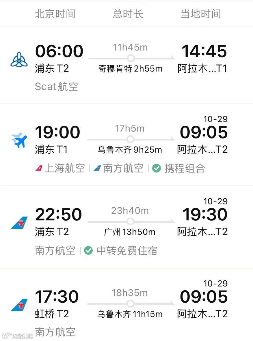 ◦ 中国南方航空CZ5097航班,每日1班,10月26日起调整为18:40从北京大兴机场起飞,21:40抵达阿拉木图,耗时6小时。