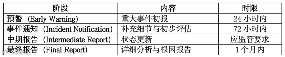 NIS2 将重大事件的报告流程细分为阶段化时限(NIS2与成员国规则具体化后仍可能调整,但指令层面有明确的时间框架):