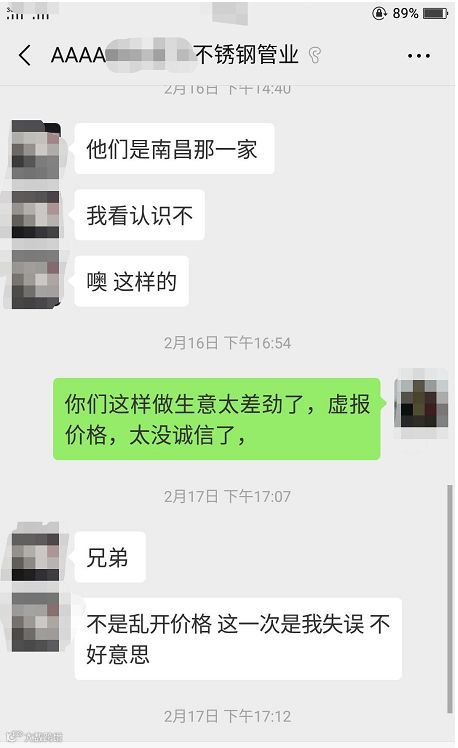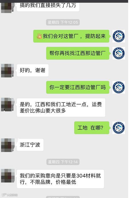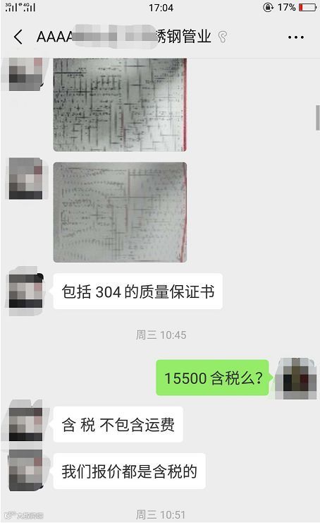据了解,涉事管厂业务员与客户在微信上谈好的价钱是15500包税的!以低于市场价,吸引客户过去工厂之后想霸王硬上,又说这管报错价了!是不含税价!最大损失就是在初步商谈好价钱当天客户的公司经理和业务经理分别从浙江与湖南娄底连夜赶过去签合同!结果等客户到了那边又说开税!要另外加钱!