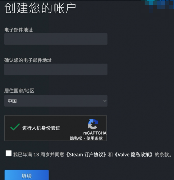 填写邮箱、勾选协议、完成验证码。注:如果IP仍是原地区,Steam 会自动将商店地区设为你的本地。