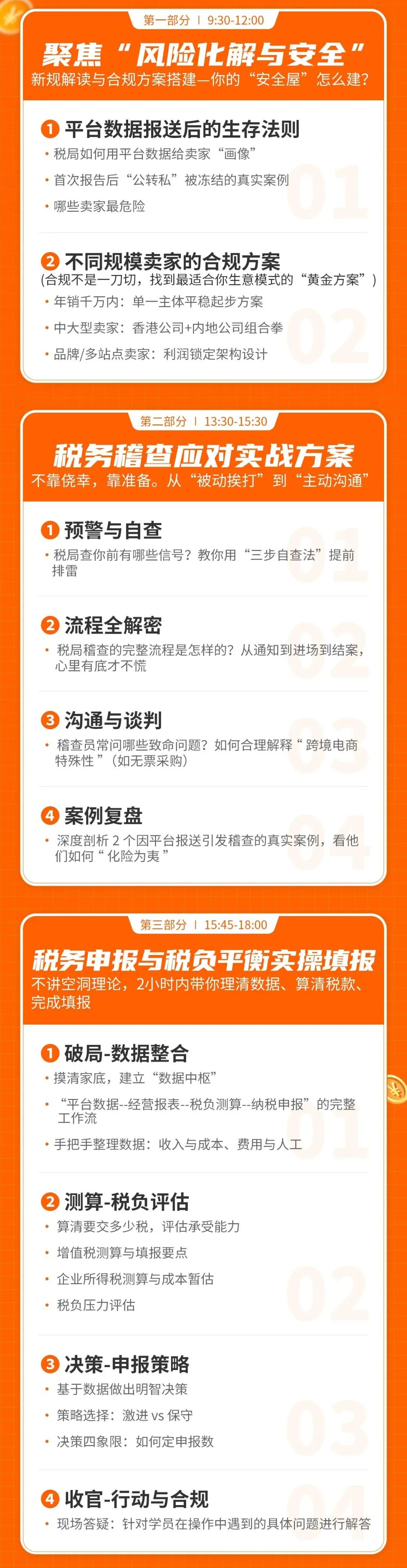 上午(9:30-12:00):风险化解与安全解读平台数据报送后的生存法则 —— 税局如何通过平台数据给卖家“画像”?首次报告后“公转私”被冻结的真实案例有哪些警示?不同规模卖家的合规方案如何定制?