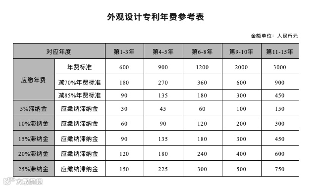 外观设计专利年费参考表