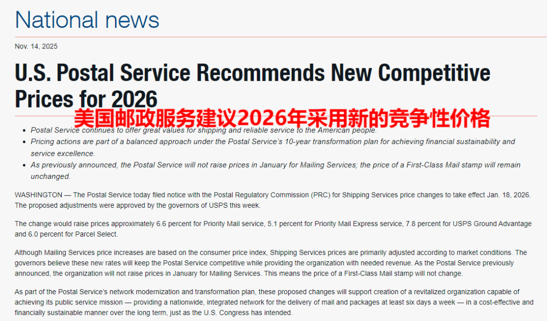 此外,美国邮政还计划于明年初上调邮资,预计优先邮件(Priority Mail)邮资上涨6.6%,优先邮件快递(Priority Mail Express)上涨5.1%,地面优势服务(USPS Ground Advantage)上涨7.8%,批量寄送服务(Parcel Select)上涨6%。