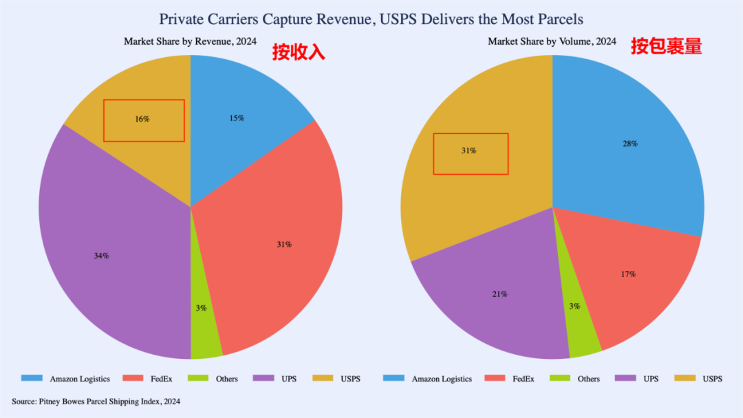 据美国邮政估计,2024年其平均每天递送2390万个包裹。按包裹量计算,其市场份额超过30%。但按收入计算,其市场份额仅有约16%。这足以说明,美国邮政亟需提升赚钱能力。