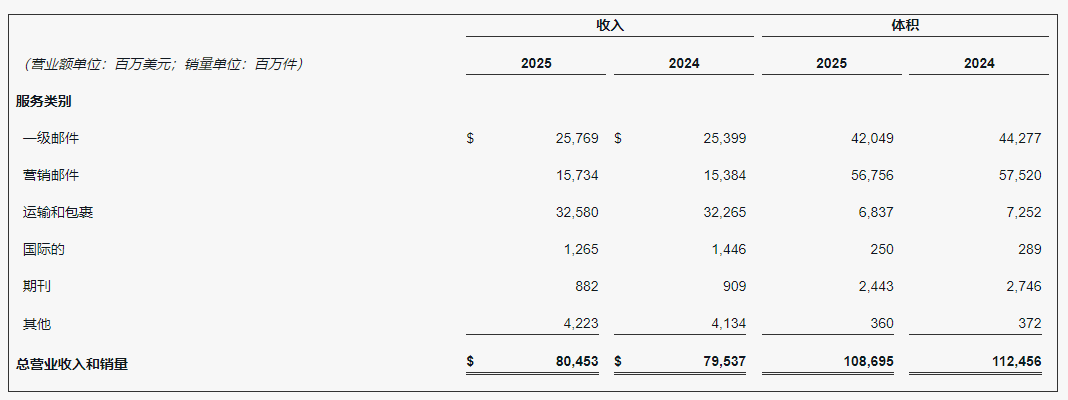 与上年相比,一级邮件收入增长3.7亿美元,增幅1.5%,但邮件量下降22亿件,降幅5.0%;营销邮件收入增长3.5亿美元,增幅2.3%,但邮件量下降7.64亿件,降幅1.3%;运输和包裹收入增长3.15亿美元,增幅1.0%,但邮件量下降4.15亿件,降幅5.7%。
