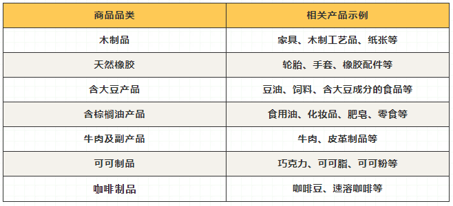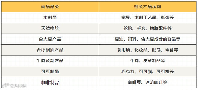 此次法规管控范围非常具体,主要针对以下七大类商品及其衍生品: