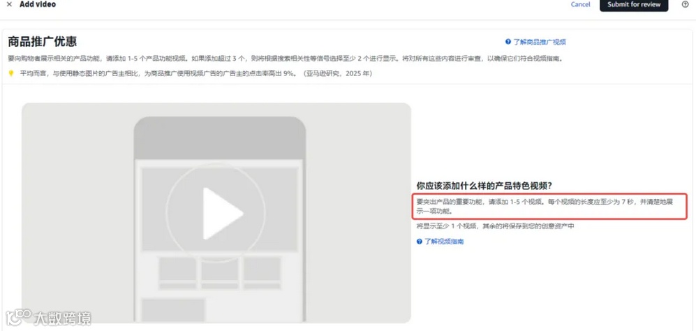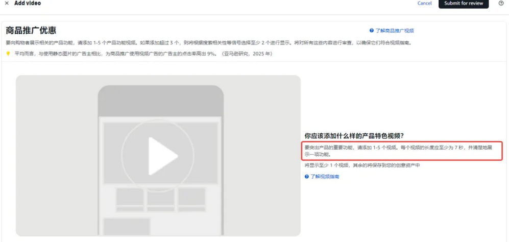 视频时长需至少7秒,亚马逊会根据广告位、用户意图等自动剪辑核心片段