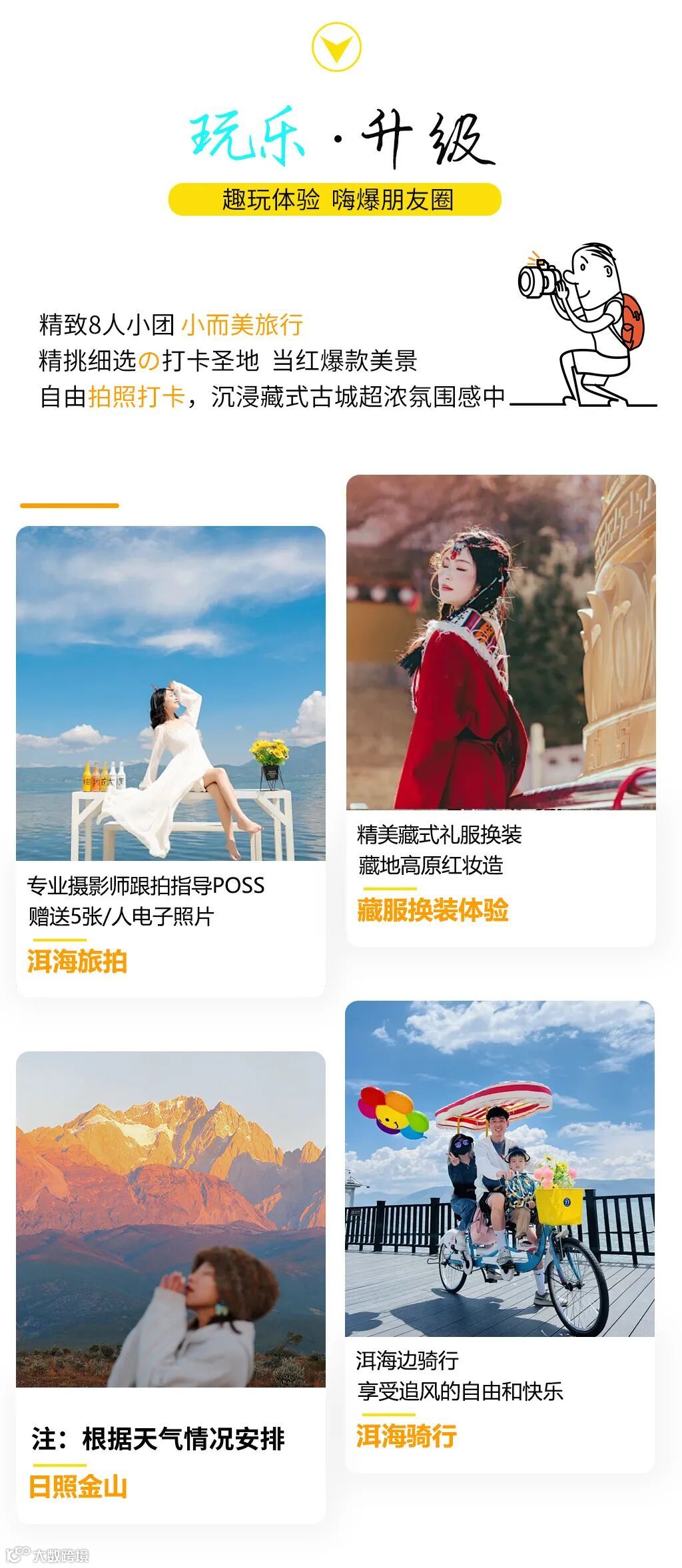 1、洱海廊道的骑行过程中,摄影师以大理洱海为背景,借助洱海边的网红道具(玻璃球、白椅子、白桌子,天空之镜等)进行拍摄,旅拍含5张/人电子照片,原片不赠送,赠送1人1杯海边茶饮。