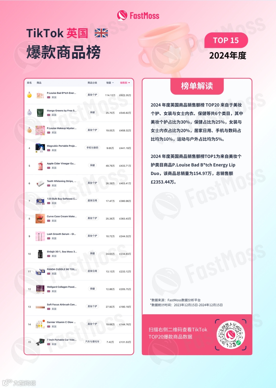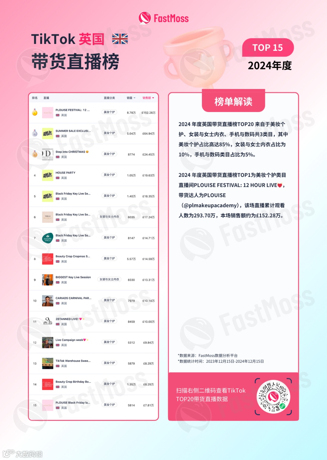 2024年度英国小店销售额TOP1为Virgo boutique,年度销售额约为4171.30万英镑;美妆护理类目达人PLOUISE位居带货达人榜榜首,带货GMV为£1120.46万。
