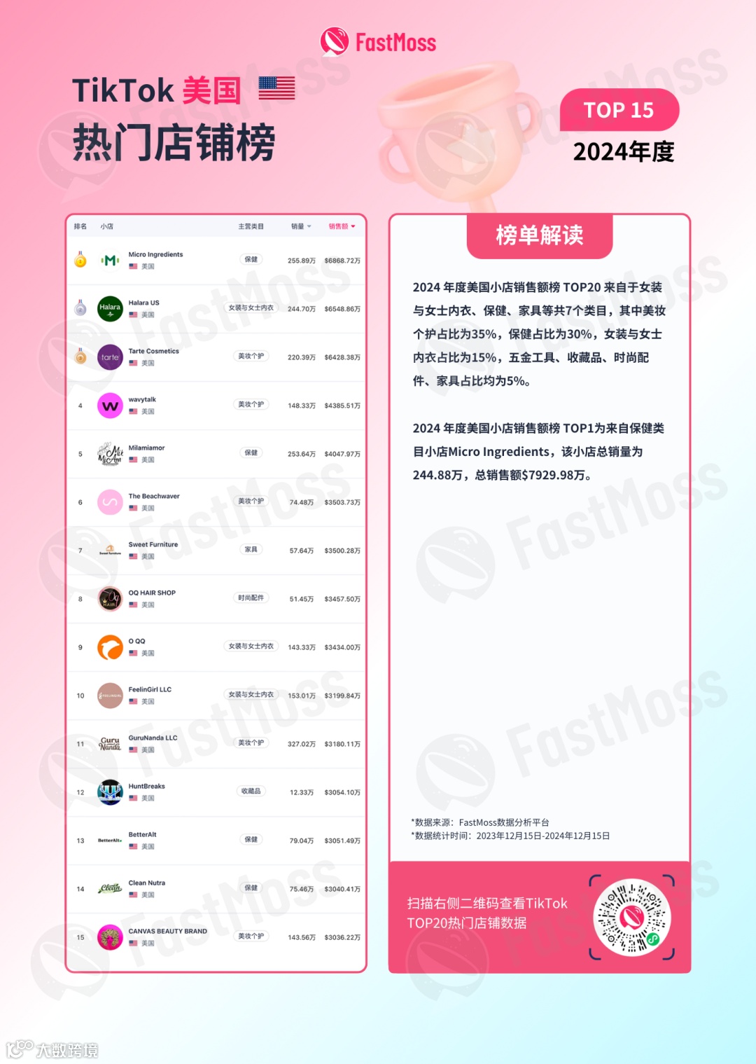 2024年度美国TikTok小店销售额TOP1为MicroIngredients,年度销售额约为6868.72万美元;美妆护理类目达人Alle Brean位居带货达人榜榜首,累计GMV约为1199.59万美元。