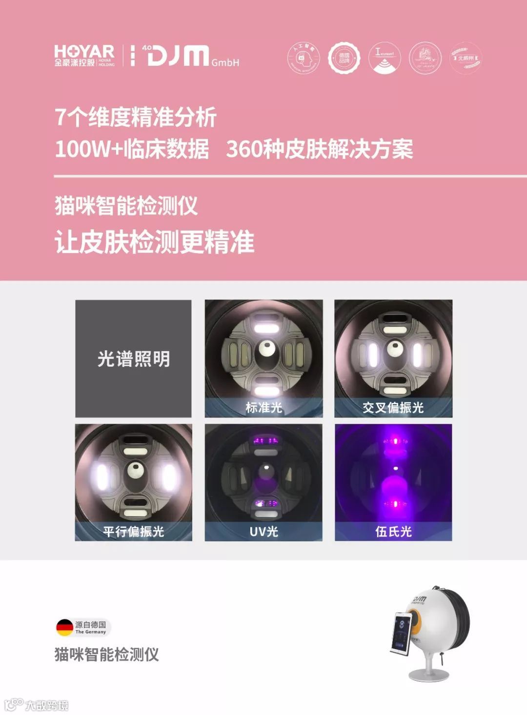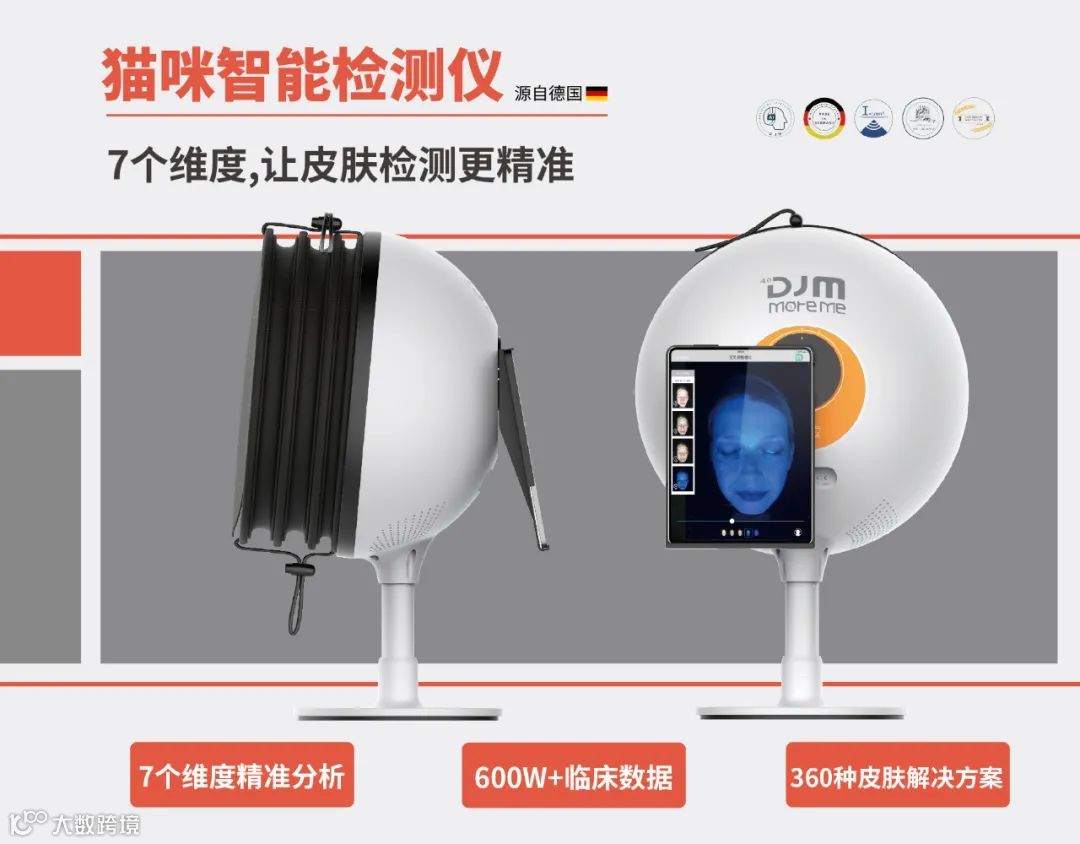 猫咪智能检测仪 是一款运用五色光谱原理,通过600W+临床数据,以皮肤病理维度、敏感维度、皱纹维度、毛孔维度、色斑维度、粉刺维度、紫质维度7大问题维度进行AI分析,并提供护肤解决方案的智能皮肤检测仪。