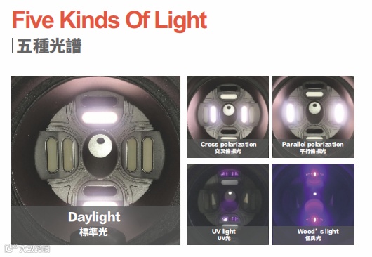 通过伍氏光对面部情况的反应体现杂质情况,并通过伍氏图、棕色图、黑白图进行体现分析