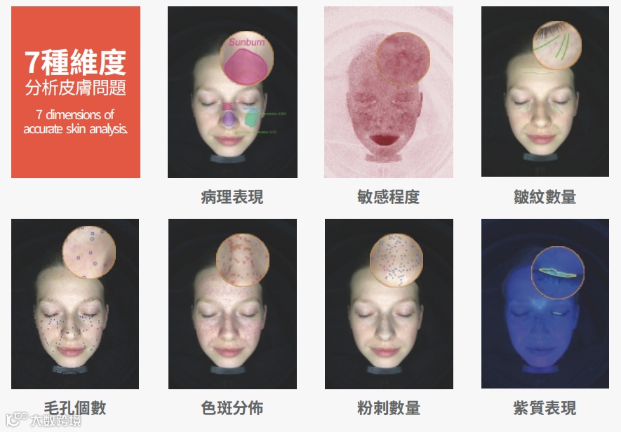 识别面部皮肤存在的所有病理,并通过日光图、极化图、纹理图、趋势图进行具象化体现