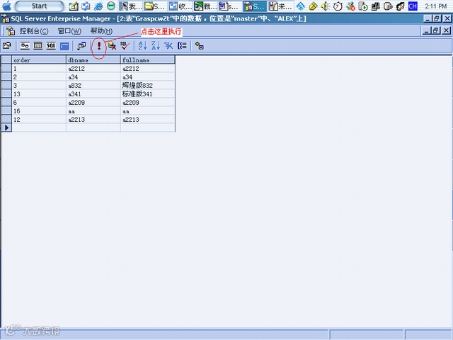 5、开表后,在dbname列中输入数据库名,在fullname列中输入账套名,order列不用输入,完成后点击命令栏中的感叹号按键执行即可,退出sql企业管理器进入管家婆就可选择账套进入。