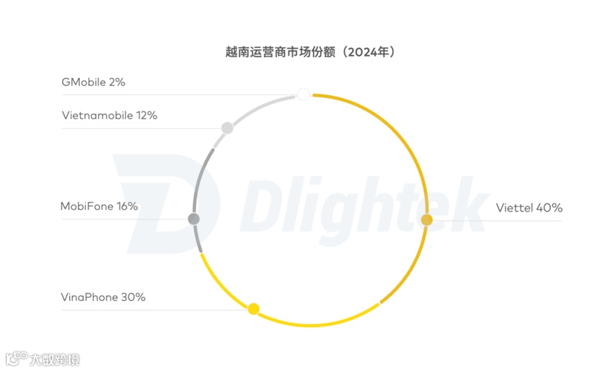 越南邮政通信集团(VNPT)旗下的Vinaphone位列第二,市场份额约30%;