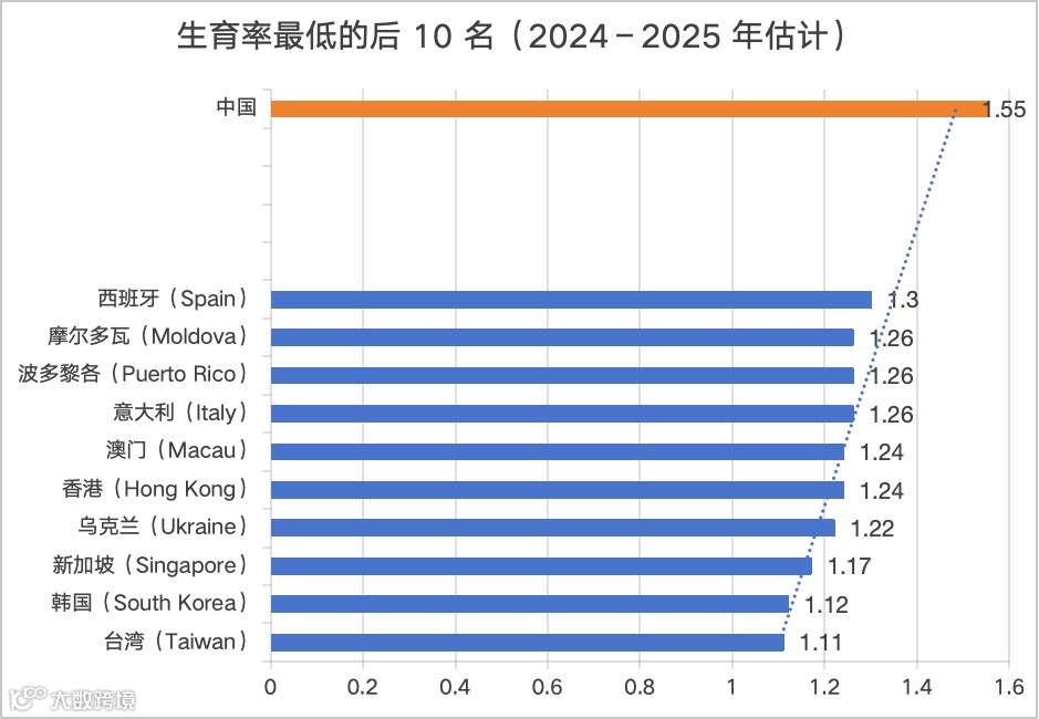 二、生育率最低的后 10 个国家(2025 估计)