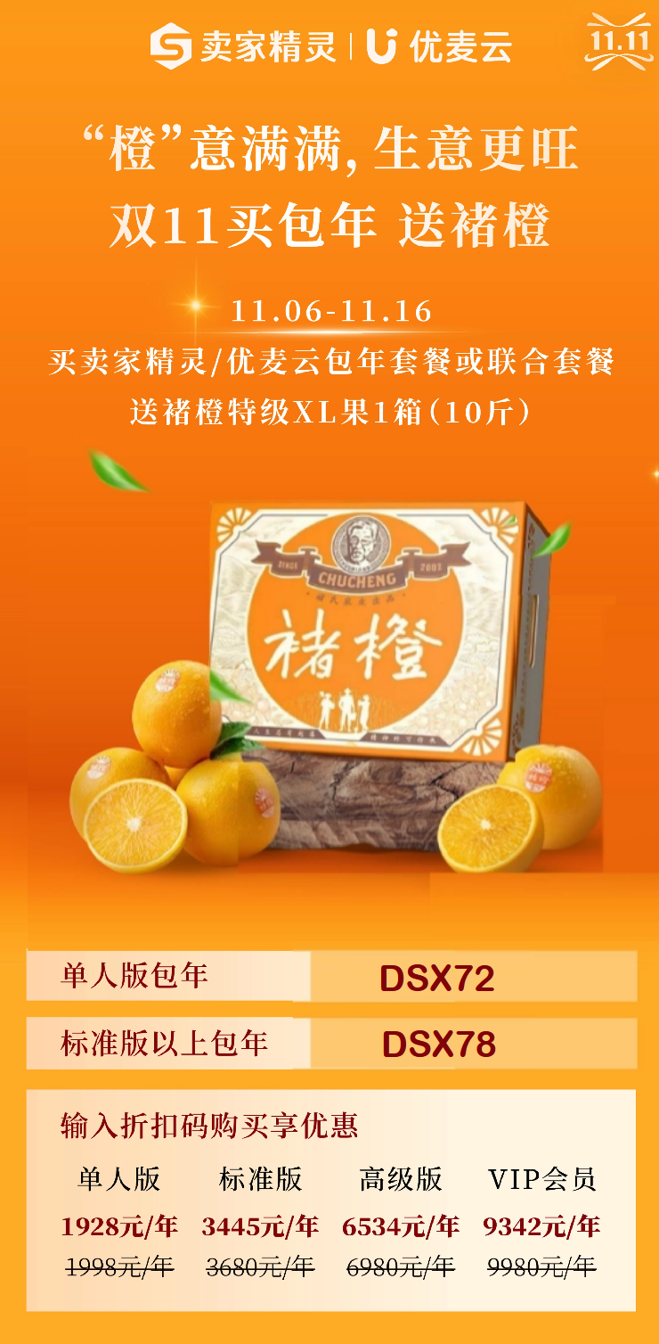 【11.06-11.16 买卖家精灵任意包年套餐,送褚橙特级XL果1箱(10斤)下单输入折扣码享优惠,单人版包年:DSX72,标准版及以上:DSX78】