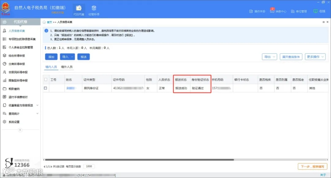 ⊙人员信息采集:录入离职员工信息,选择“正常”后报送,再改为“非正常”并填写离职日期后报送;