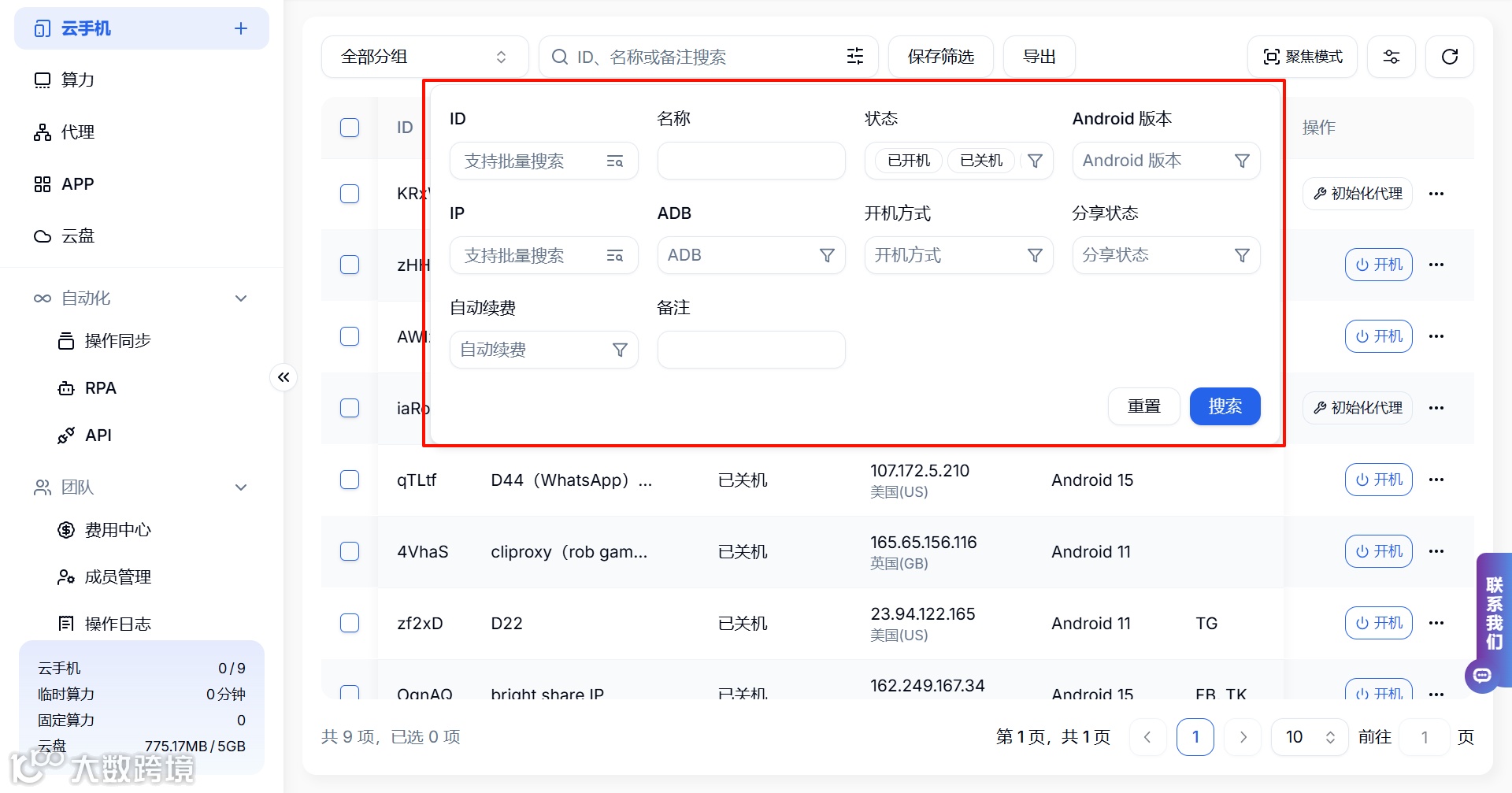DuoPlus结合用户需求,优化全部页面的搜索交互,并统一了搜索入口,用户可以在高级搜索栏选择多个搜索条件来查找对应的项目。