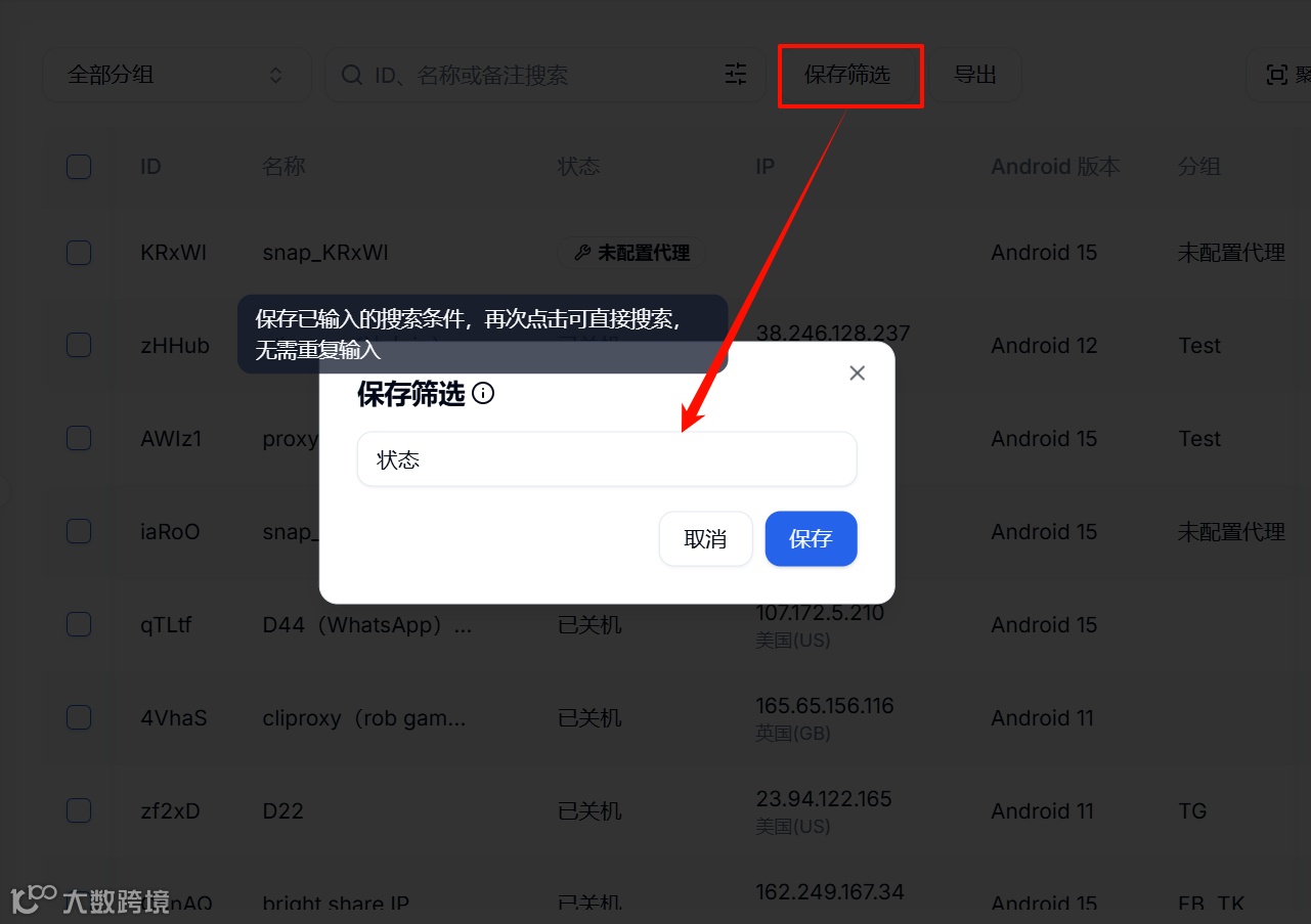 DuoPlus用户可以通过【保存筛选】来固定输入的搜索条件,保存后即可生成筛选器,用户可以直接点击筛选器来查找对应的云手机,更加快速便捷。