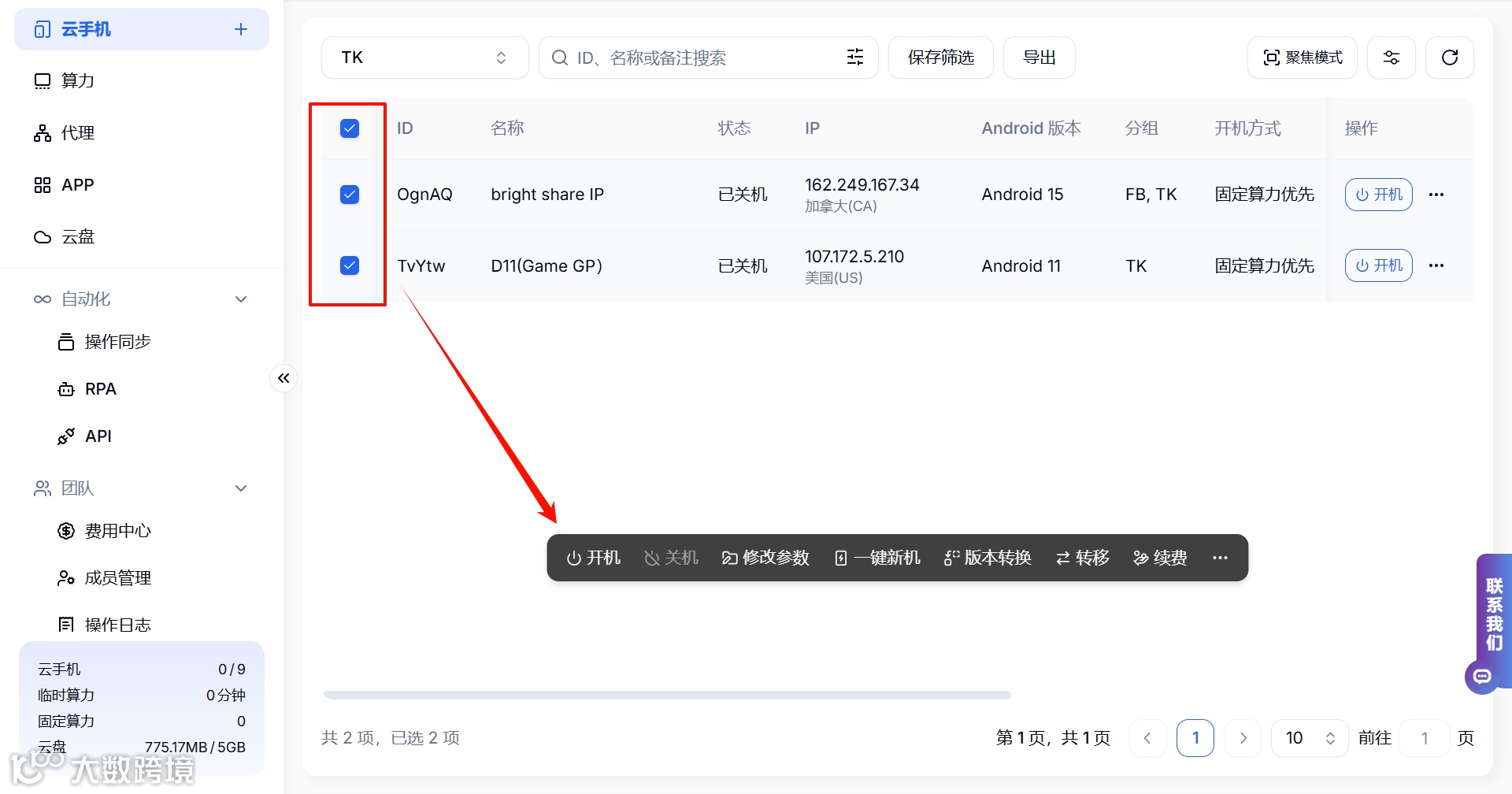 DuoPlus优化批量操作功能的交互体验,当用户勾选需要操作的云手机时,批量操作的功能栏将自动显示,方便用户直接点击要执行的操作。