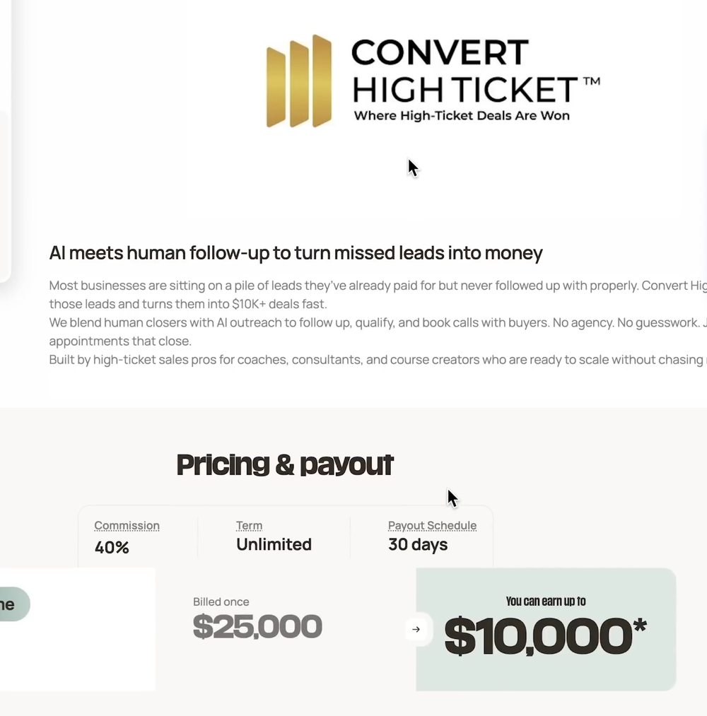 你可能会问,谁会花那么多钱买这个项目呢?它其实是一个为期三天的一对一现场项目,会有专业人员帮助企业主或在线教练,评估并优化他们的销售系统,还会在人工智能方面提供帮助,第三天还有一对一培训。这个产品不是适合所有人,但肯定有人愿意花25000美元买。你要是推广出去,每卖一单就能赚10000美元。