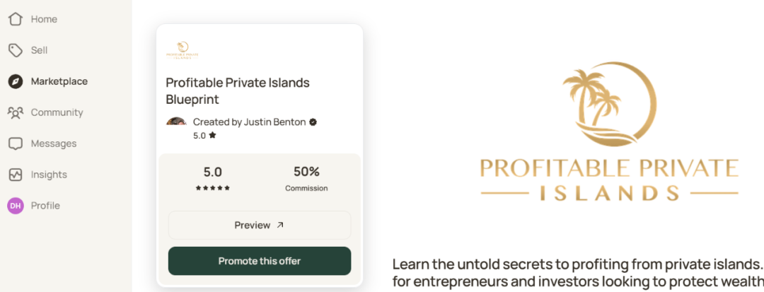 还有个挺酷的产品,叫“盈利私人岛屿蓝图”,能让人一步步学习怎么买私人岛屿,怎么识别、获取和从私人岛屿上盈利。这挺疯狂的,这个产品的佣金是248美元。