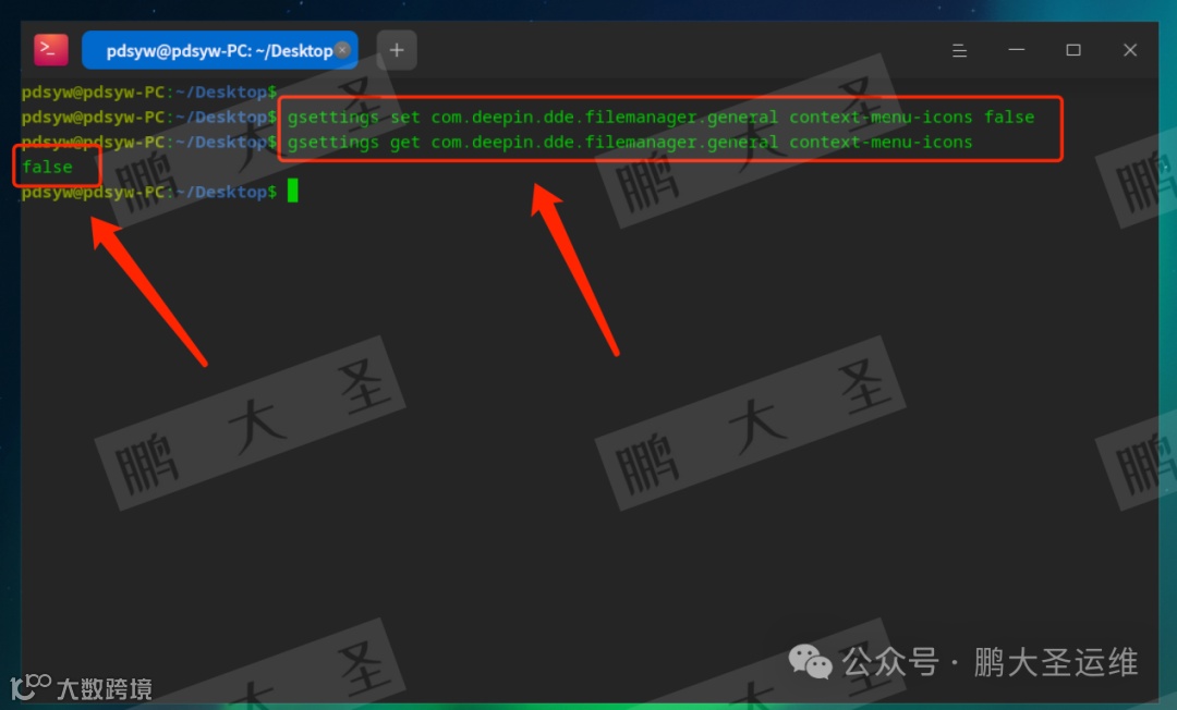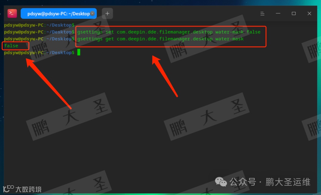 pdsyw@pdsyw-PC:~/Desktop$ gsettings set com.deepin.dde.filemanager.desktop water-mask falsepdsyw@pdsyw-PC:~/Desktop$ gsettings get com.deepin.dde.filemanager.desktop water-maskfalsepdsyw@pdsyw-PC:~/Desktop$