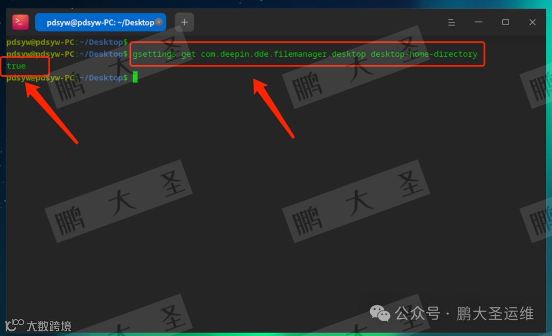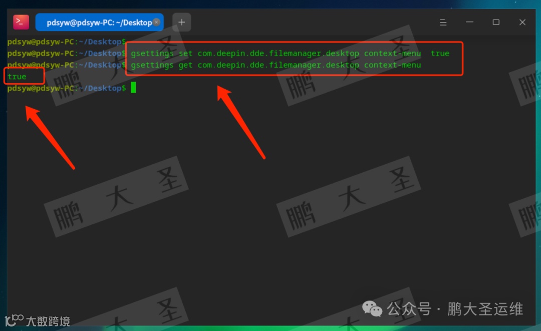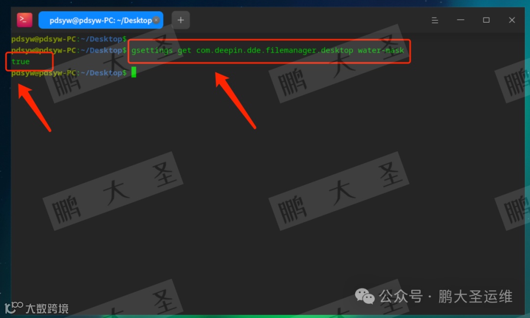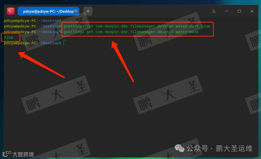 pdsyw@pdsyw-PC:~/Desktop$ gsettings set com.deepin.dde.filemanager.desktop water-mask truepdsyw@pdsyw-PC:~/Desktop$ gsettings get com.deepin.dde.filemanager.desktop water-masktruepdsyw@pdsyw-PC:~/Desktop$