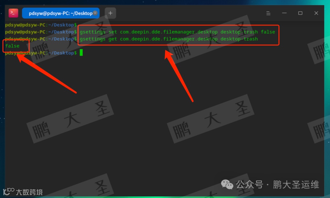 pdsyw@pdsyw-PC:~/Desktop$ gsettings set com.deepin.dde.filemanager.desktop desktop-trash falsepdsyw@pdsyw-PC:~/Desktop$ gsettings get com.deepin.dde.filemanager.desktop desktop-trashfalsepdsyw@pdsyw-PC:~/Desktop$