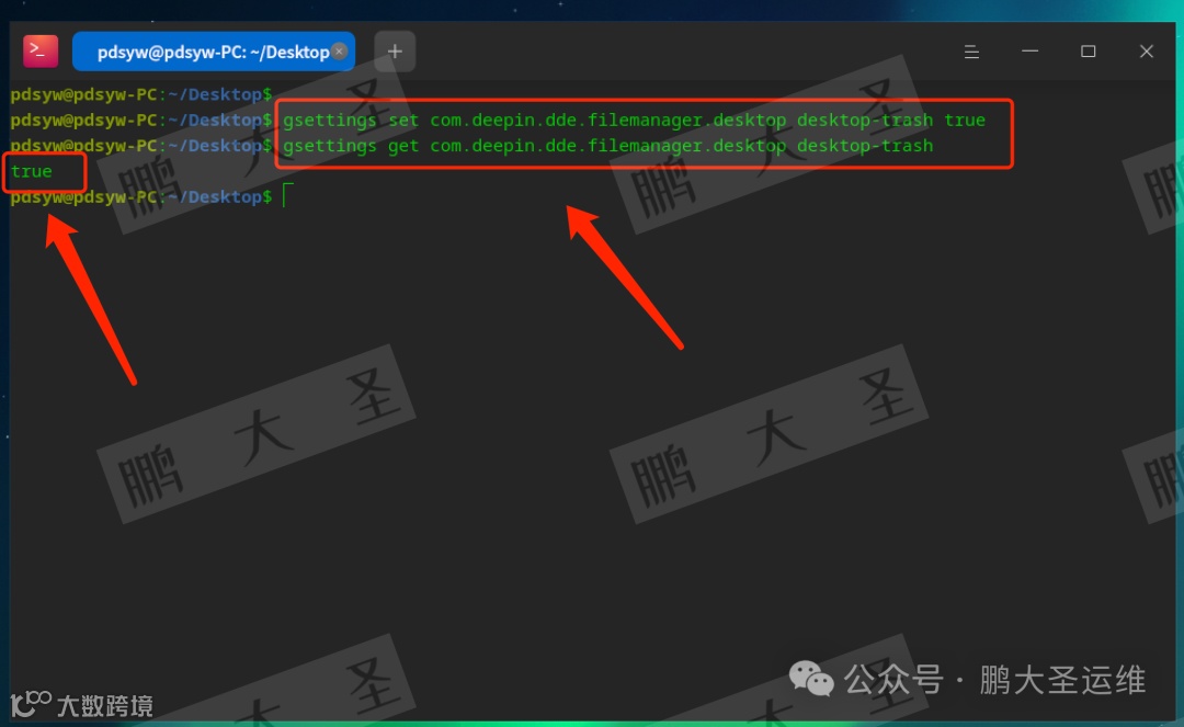 pdsyw@pdsyw-PC:~/Desktop$ gsettings set com.deepin.dde.filemanager.desktop desktop-trash truepdsyw@pdsyw-PC:~/Desktop$ gsettings get com.deepin.dde.filemanager.desktop desktop-trashtruepdsyw@pdsyw-PC:~/Desktop$