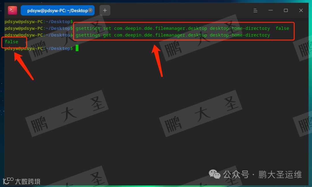 pdsyw@pdsyw-PC:~/Desktop$ gsettings set com.deepin.dde.filemanager.desktop desktop-home-directory falsepdsyw@pdsyw-PC:~/Desktop$ gsettings get com.deepin.dde.filemanager.desktop desktop-home-directoryfalsepdsyw@pdsyw-PC:~/Desktop$