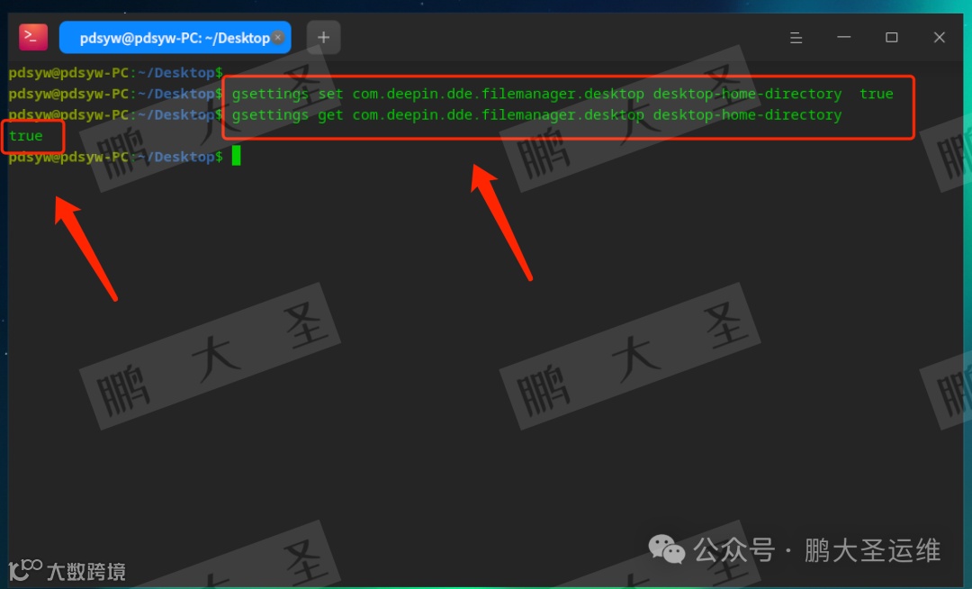pdsyw@pdsyw-PC:~/Desktop$ gsettings set com.deepin.dde.filemanager.desktop desktop-home-directory truepdsyw@pdsyw-PC:~/Desktop$ gsettings get com.deepin.dde.filemanager.desktop desktop-home-directorytruepdsyw@pdsyw-PC:~/Desktop$