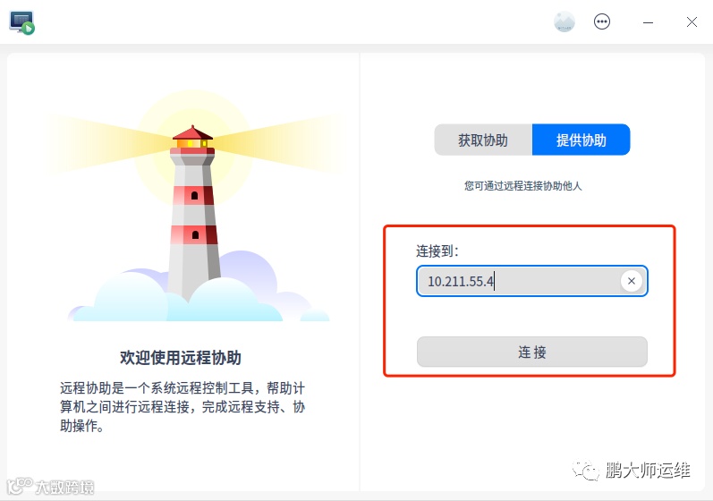 2. 在主机二远程协助界面输入主机一的IP地址并点击连接[k]。