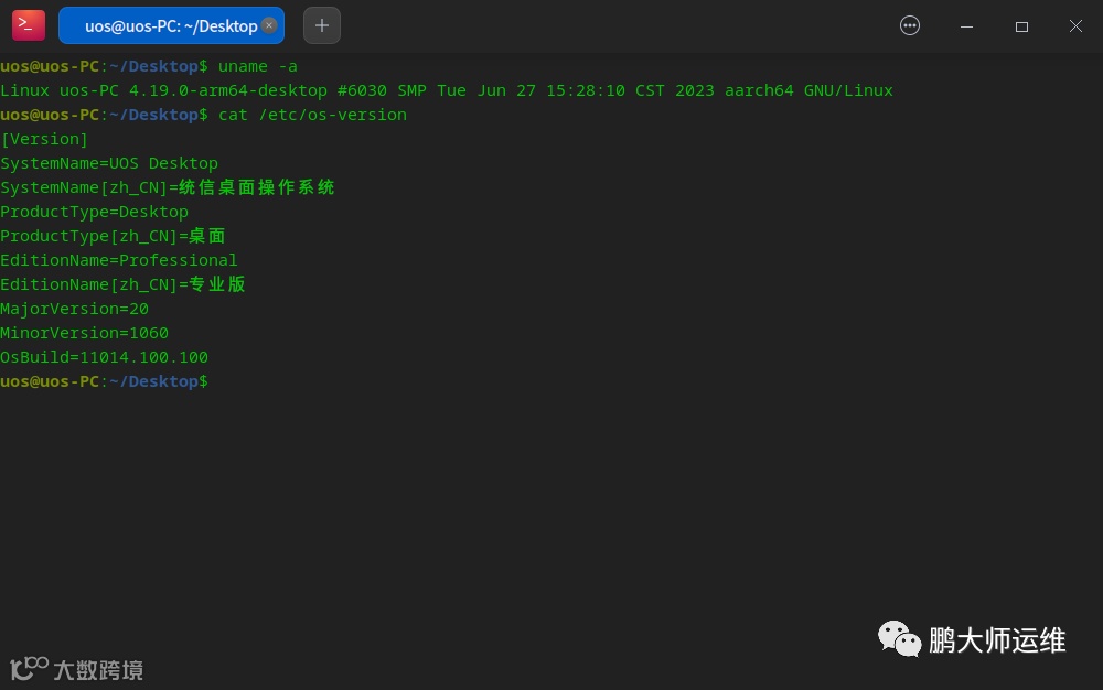 uos@uos-PC:~/Desktop$ uname -aLinux uos-PC 4.19.0-arm64-desktop #6030 SMP Tue Jun 27 15:28:10 CST 2023 aarch64 GNU/Linuxuos@uos-PC:~/Desktop$ cat /etc/os-version[Version]SystemName=UOS DesktopSystemName[zh_CN]=统信桌面操作系统ProductType=DesktopProductType[zh_CN]=桌面EditionName=ProfessionalEditionName[zh_CN]=专业版MajorVersion=20MinorVersion=1060OsBuild=11014.100.100uos@uos-PC:~/Desktop$