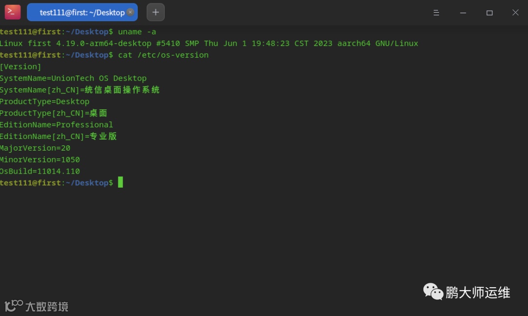 test111@first:~/Desktop$ uname -aLinux first 4.19.0-arm64-desktop #5410 SMP Thu Jun 1 19:48:23 CST 2023 aarch64 GNU/Linuxtest111@first:~/Desktop$ cat /etc/os-version[Version]SystemName=UnionTech OS DesktopSystemName[zh_CN]=统信桌面操作系统ProductType=DesktopProductType[zh_CN]=桌面EditionName=ProfessionalEditionName[zh_CN]=专业版MajorVersion=20MinorVersion=1050OsBuild=11014.110test111@first:~/Desktop$