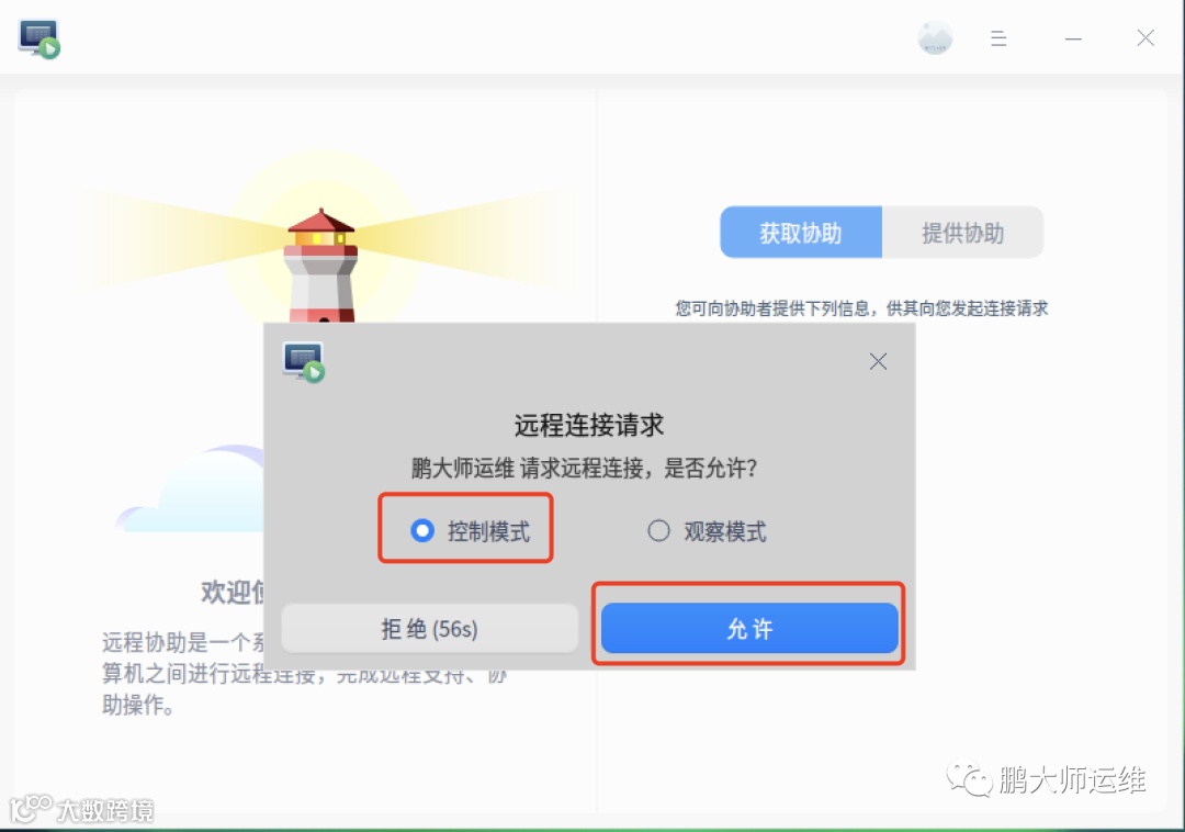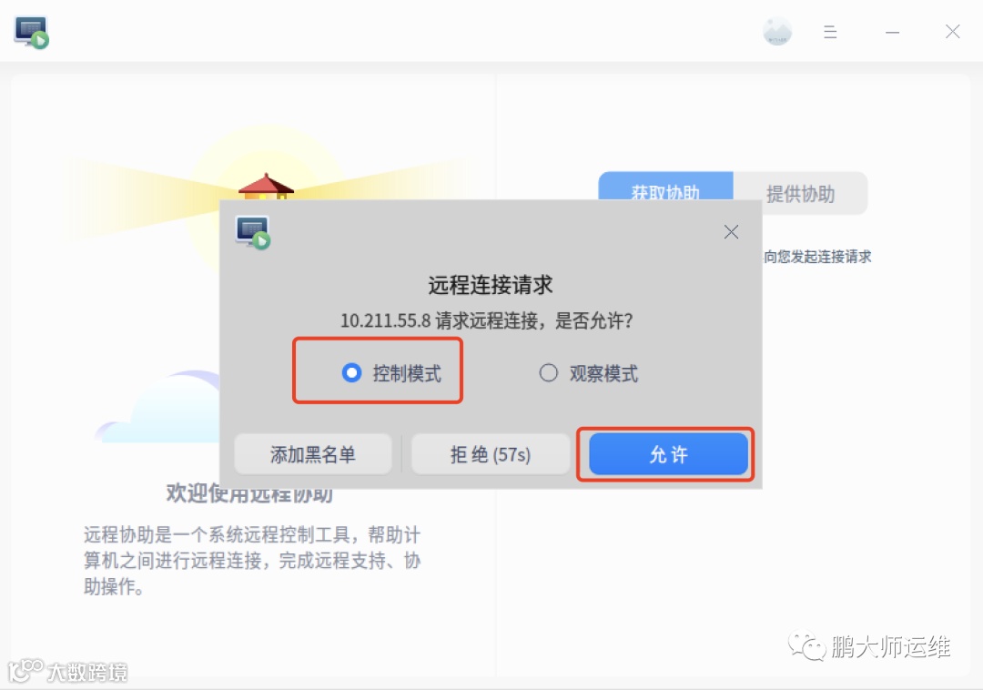 5. 主机一端选择控制模式并点击“允许”[k]。