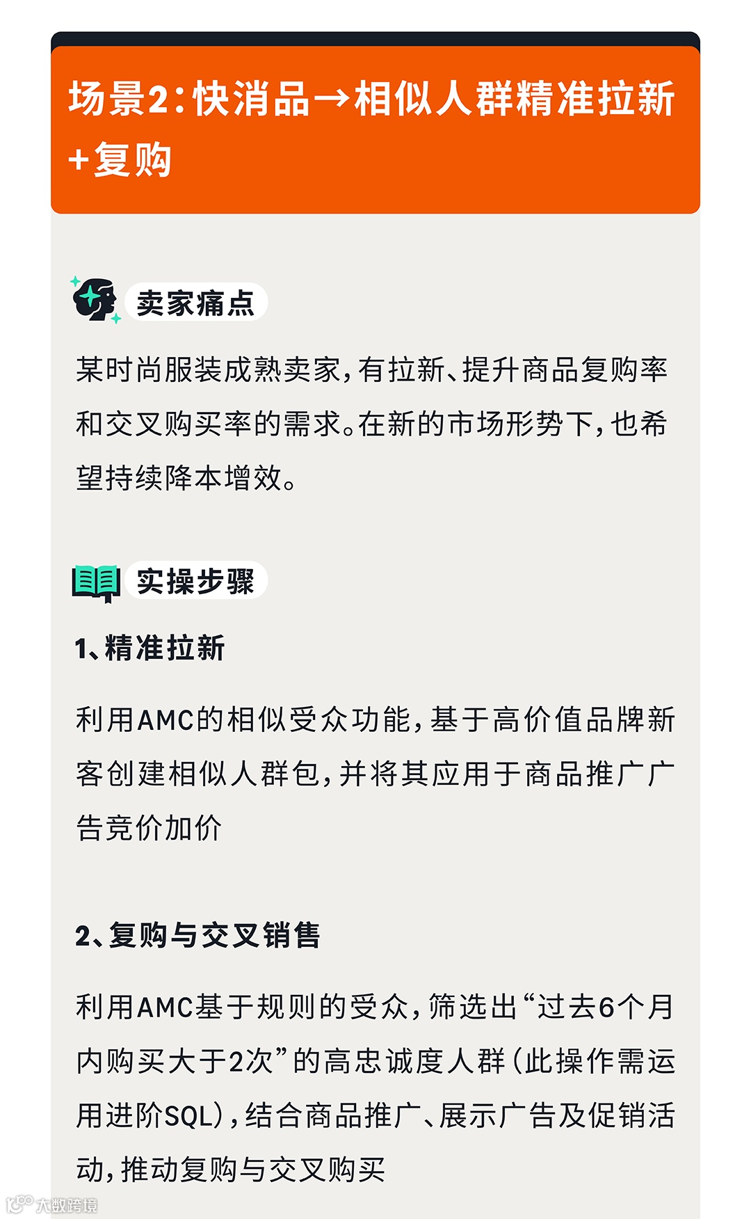 AMC的核心优势在于其精准受众投放功能。基于消费者细颗粒度的事件级数据,如曝光、点击、互动、加购、购买等,卖家可以精准定位高价值人群,减少预算浪费,提升广告转化率。例如,通过识别“多次浏览却未下单”的高意向人群,进行针对性广告投放,可使转化率大幅提升。