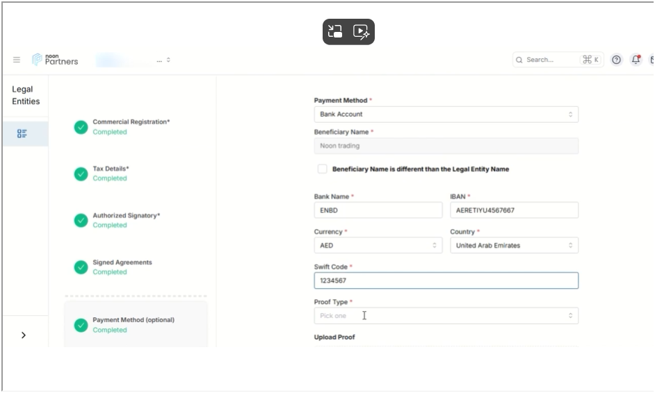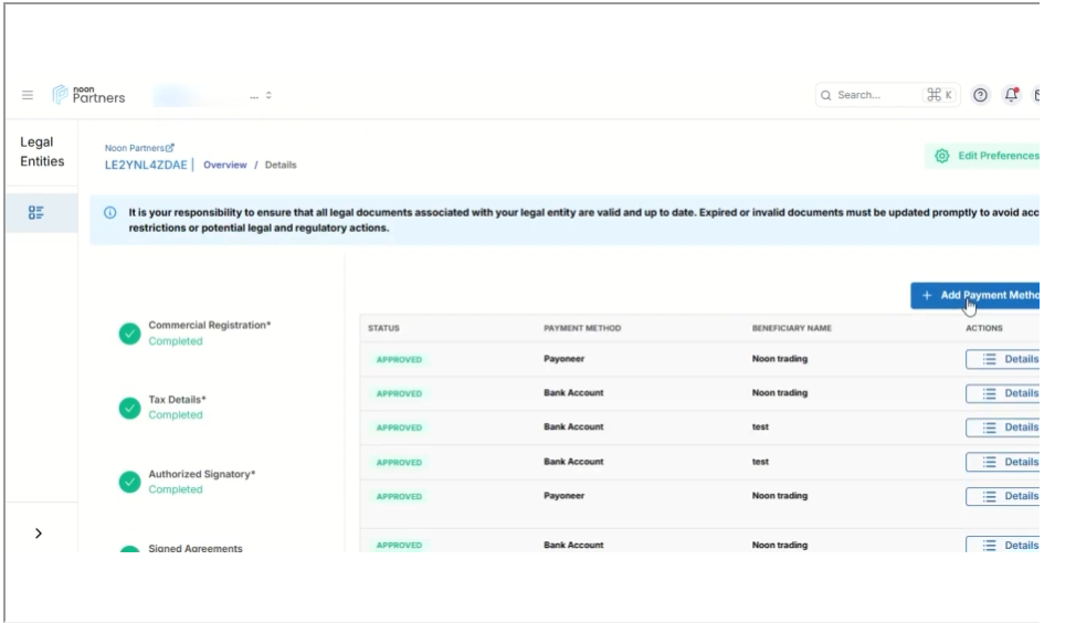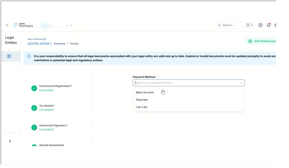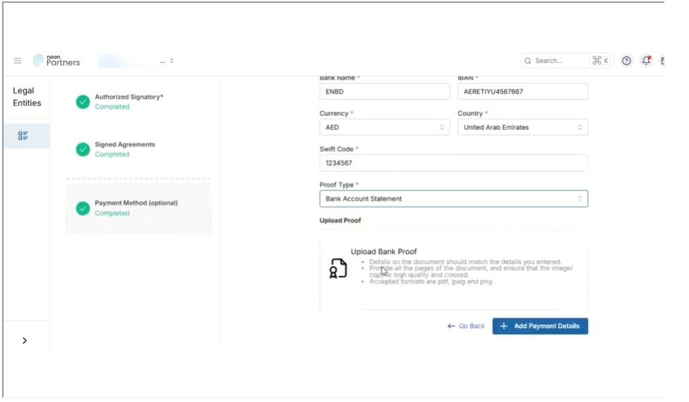 账户一致性:确保用于收款的银行账户持有人姓名与您在Noon平台注册的法律实体名称一致,以避免因身份验证问题导致付款失败。