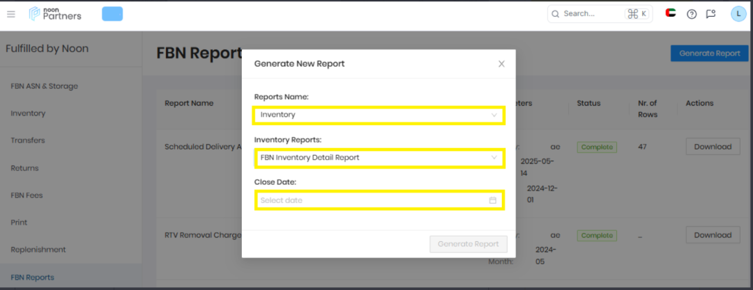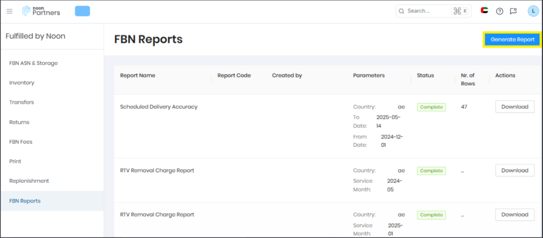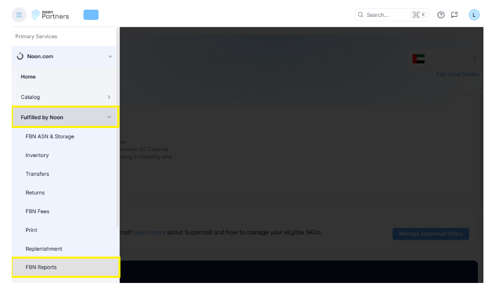 登录Noon合作伙伴平台后,点击导航菜单中的“FBN”选项,选择“FBN报告”