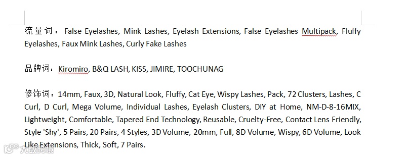 2. 后台Search Terms: - 填充二/三/四类关键词(避免重复) - 示例: diy extension,cluster eyelash,wispy fluffy