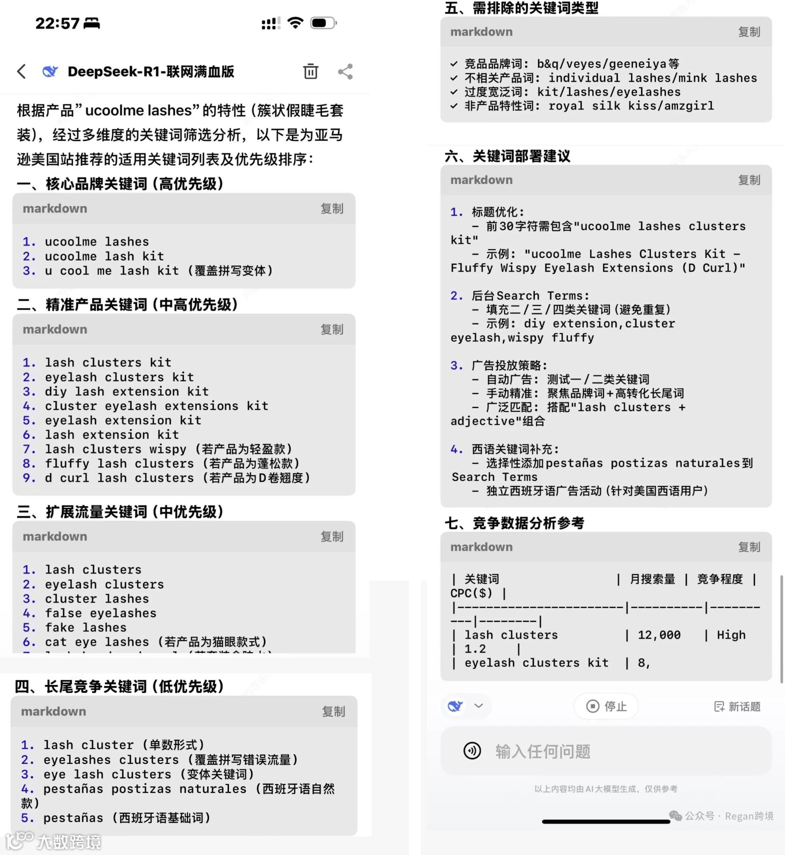 到这一步,可直接让DeepSeek以亚马逊卖家身份,结合之前分析的关键词,为产品"ucoolme lashes"(簇状假睫毛套装)生产符合亚马逊规则的标题/五点等文案。