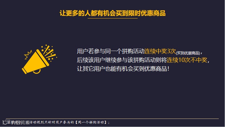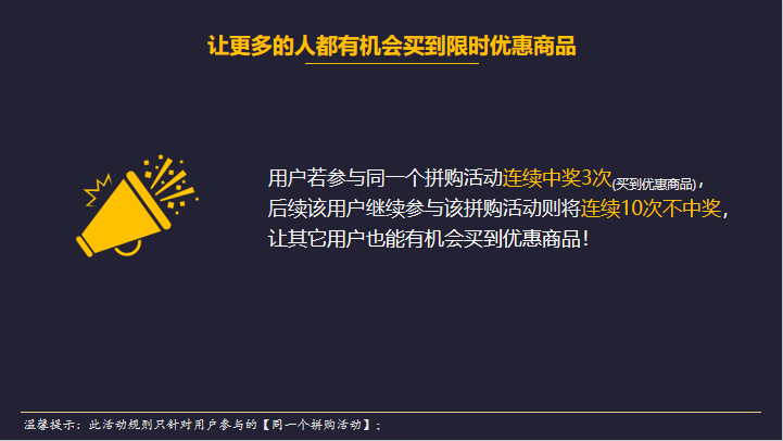 概率动态调:拼团的人多,就稍微降点中奖率;人少的时候就提高,保证随时都有人愿意拼。