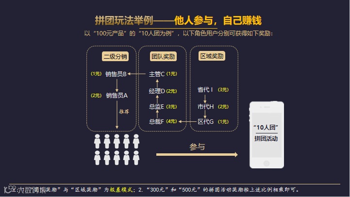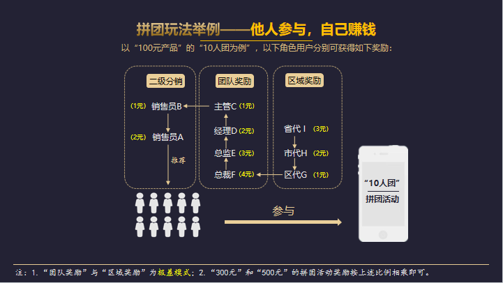 对平台:拉新成本比打广告低 10 倍(一个团队长一年能拉 1.5 万用户,100 个团队长就是 150 万用户),每天流水能到 3 亿(比如 15 万团长,每人每天拼 20 次 100 元的团),赚钱速度堪比 “印钞机”;