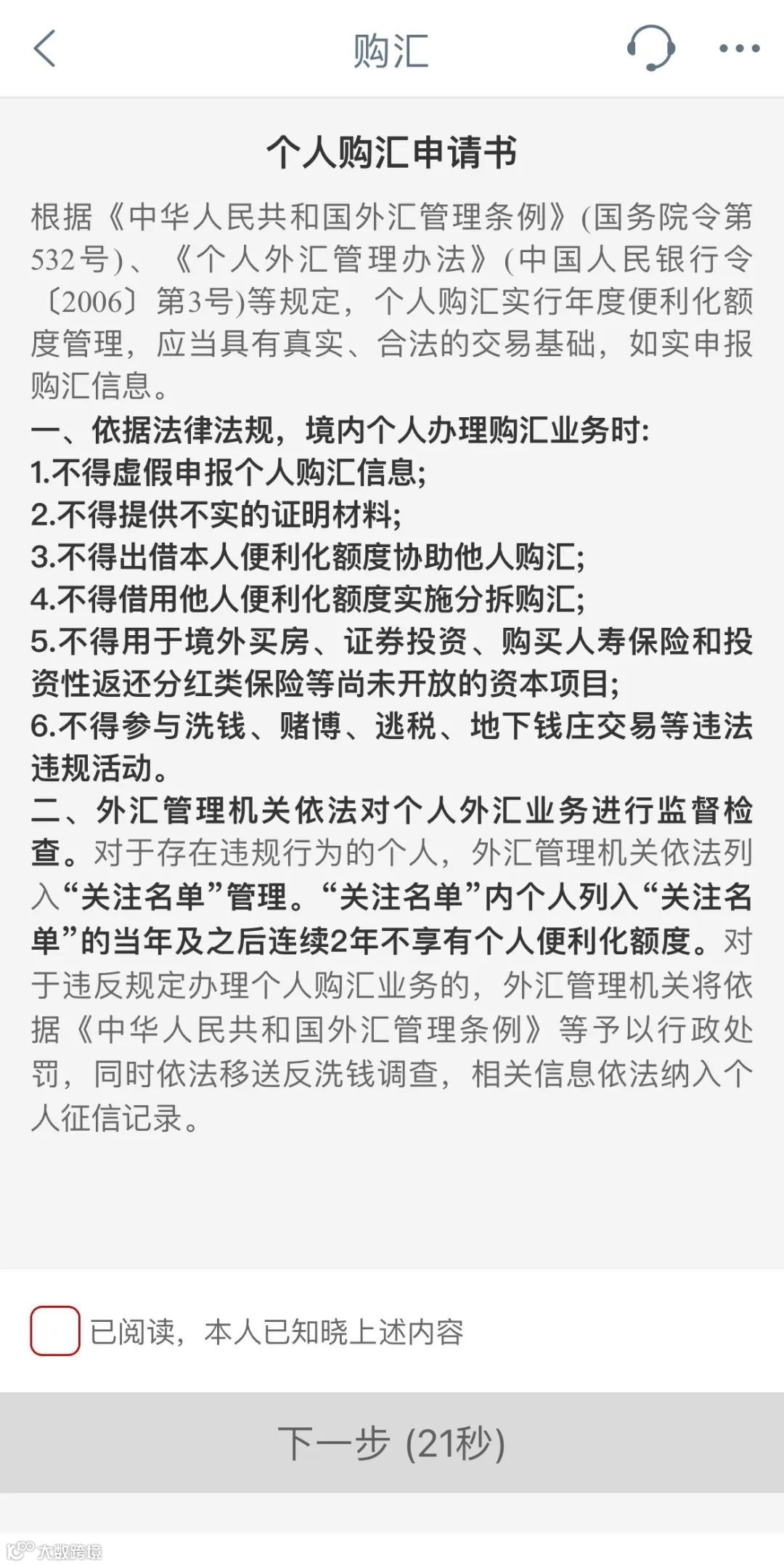 确认信息无误后勾选协议,点击“下一步”完成购汇。整个过程无手续费[k]。