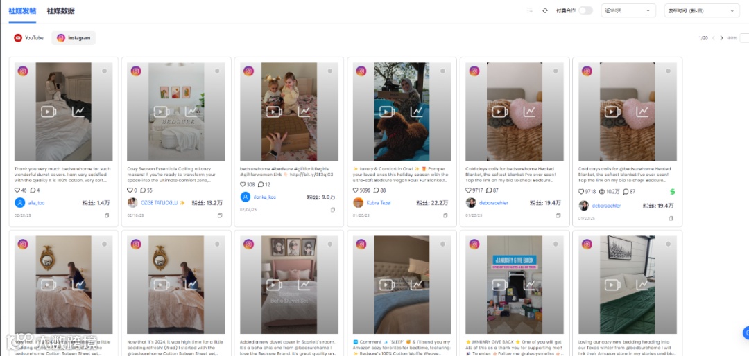 除了定期生产内容并通过社媒平台向外做传播以外,我们通过使用SocialBook自研SaaS平台的【竞品监听】功能,还发现了Bedsure广泛合作了大量的社媒红人来帮助品牌提升知名度和美誉度。