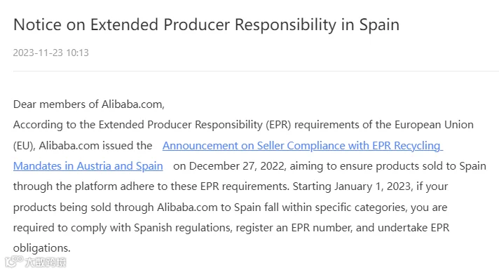 近日阿里巴巴国际站发布西班牙生产者责任延伸(EPR)公告,公告如下: